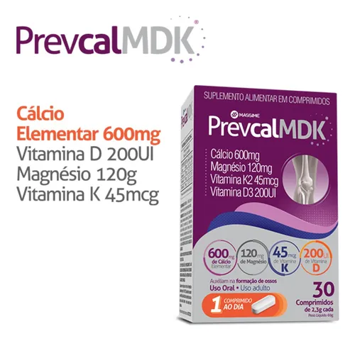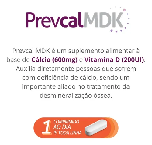 O PREVCAL MDK ajuda a cobrir a necessidade diária de cálcio, magnésio e vitaminas D e K, que são importantes para o bom funcionamento do organismo.